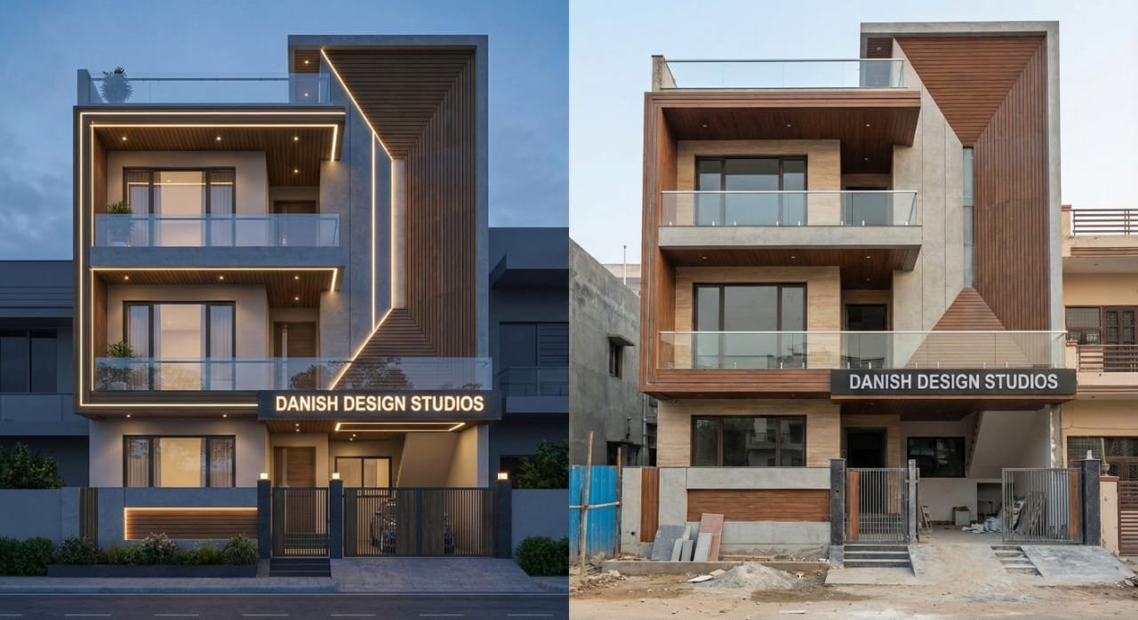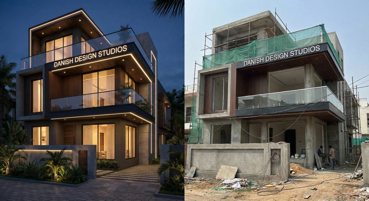 From Render to Reality: This collection of images showcases several luxury residential projects by Danish Design Studios, highlighting the precision with which digital visualizations are being translated into built forms. Perspective and Framing: The images provide both front-facing and angled views of the structures, emphasizing their bold geometric silhouettes and cantilevered balconies. The Visualization (Left Sides): These high-fidelity renders illustrate a sophisticated nighttime lighting scheme, featuring integrated LED strips that outline the architectural frames and highlight the textured wood and stone finishes. The Construction (Right Sides): These photos show the projects in advanced stages of completion. The core structural elements, such as the unique "angular" wood-paneled accents and glass balustrades, have been faithfully executed to match the original designs. Material Palette: Both the concepts and the physical builds utilize a modern mix of materials, including warm wood cladding, charcoal grey accents, and expansive glass surfaces to create a layered, multi-dimensional facade.