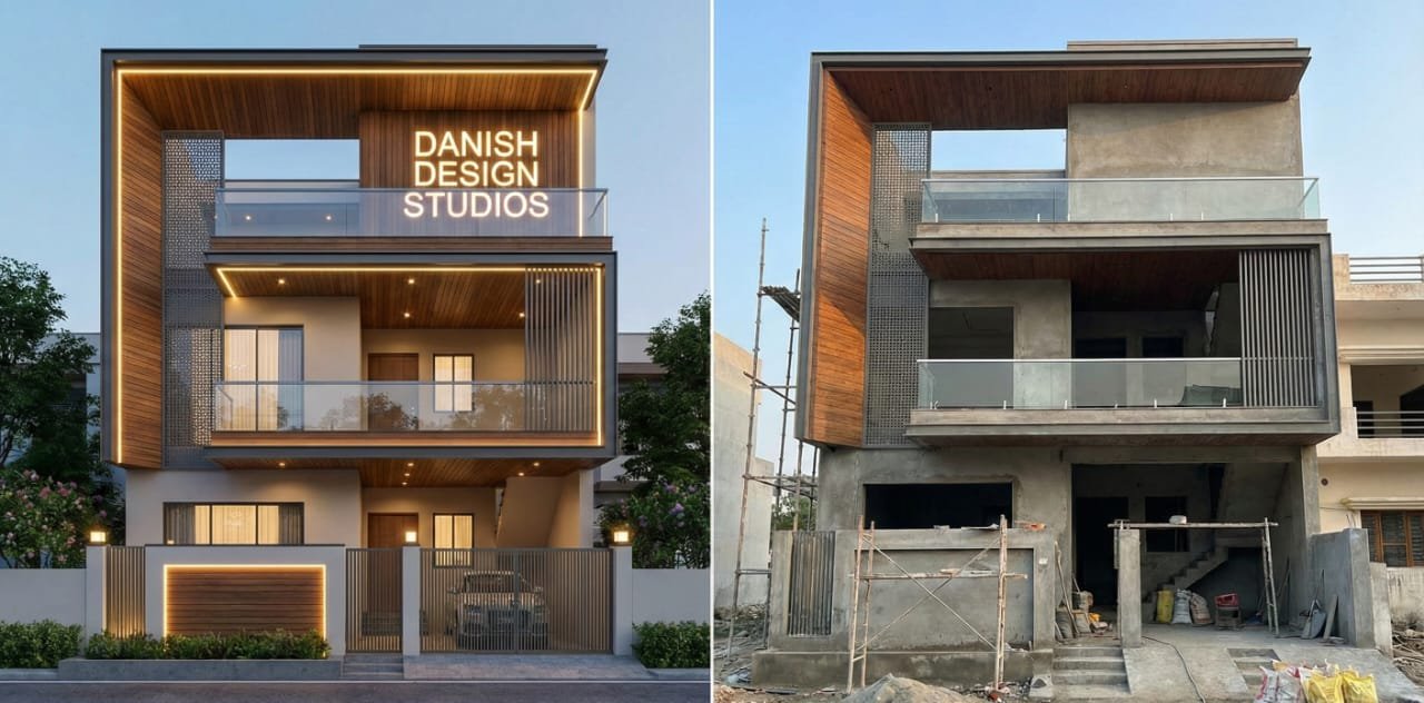 From Vision to Reality: This side-by-side comparison showcases the transformation of a contemporary residential design by Danish Design Studios. The Render (Left): Displays the finished concept featuring a sophisticated blend of warm wood cladding, charcoal grey framing, and seamless glass railings. It highlights a strategic lighting plan with recessed LEDs and ambient "cove" lighting that emphasizes the building’s geometric silhouette. The Reality (Right): Shows the building currently under construction. The core structural elements—including the cantilevered balconies, the distinctive "C-frame" exterior, and the vertical louvers—are already in place. Most of the heavy masonry is complete, and the installation of the wood-style ceiling panels is well underway, proving that the physical build is staying very true to the original artistic intent.